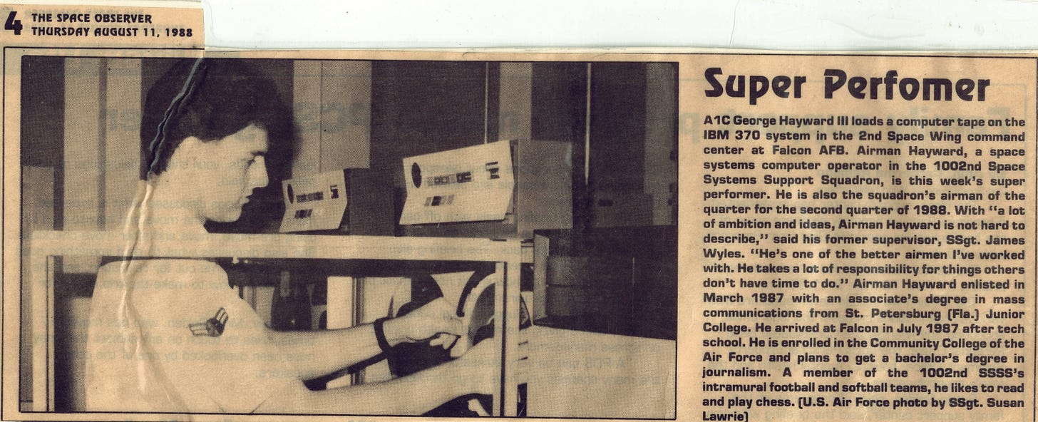 In August 1988 I was 23 years old and a year into my first duty assignment in the U.S. Air Force. As the caption describes, I was a space systems computer operator—far less cool than it sounds—and I was lucky or good enough to win some accolades, like this weekly feature in one of our local military newspapers. But I didn’t enjoy the job and it wasn’t what I wanted when I enlisted a year earlier.